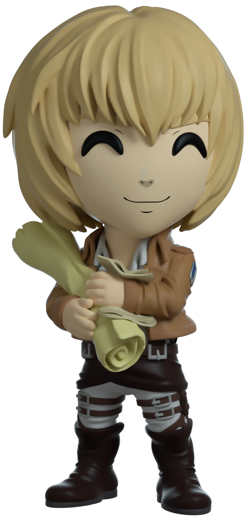 Flaming water! Frozen earth! Why do you want to see the outside world so badly? Wouldn’t it be great if, one day, we could go to explore the outside world, too? Armin Arlert stands at 4.5 inches tall wearing the standard Scout Regiment uniform. He wears a brown jacket over a white polo shirt. His pants are white and tucked inside his knee-high boots. His double-walled window box includes illustrations of Armin and Eren reading a book. This collectible ships in a matte, embossed, protective outer sleeve inside a shipping carton sealed with Youtooz tape.