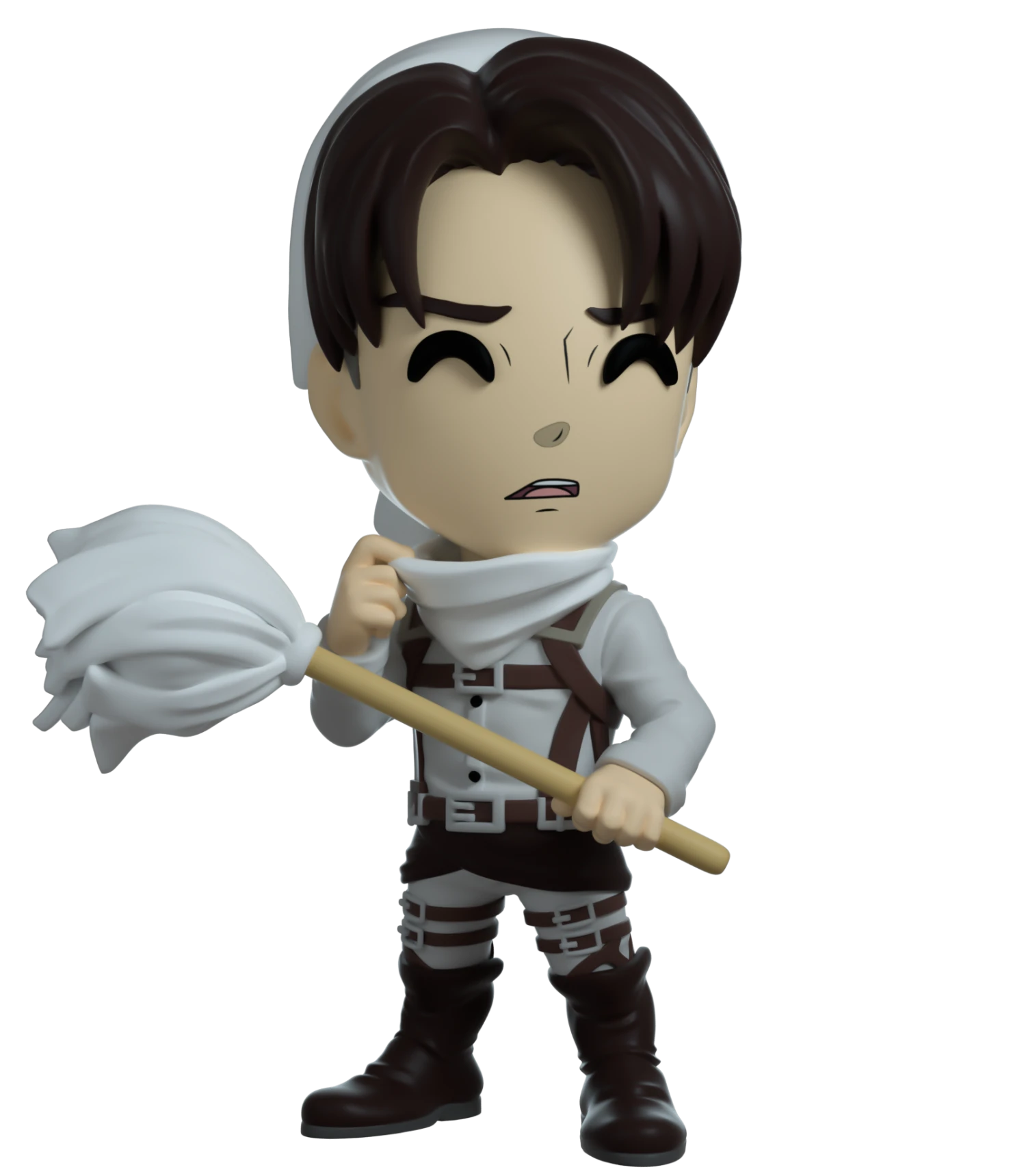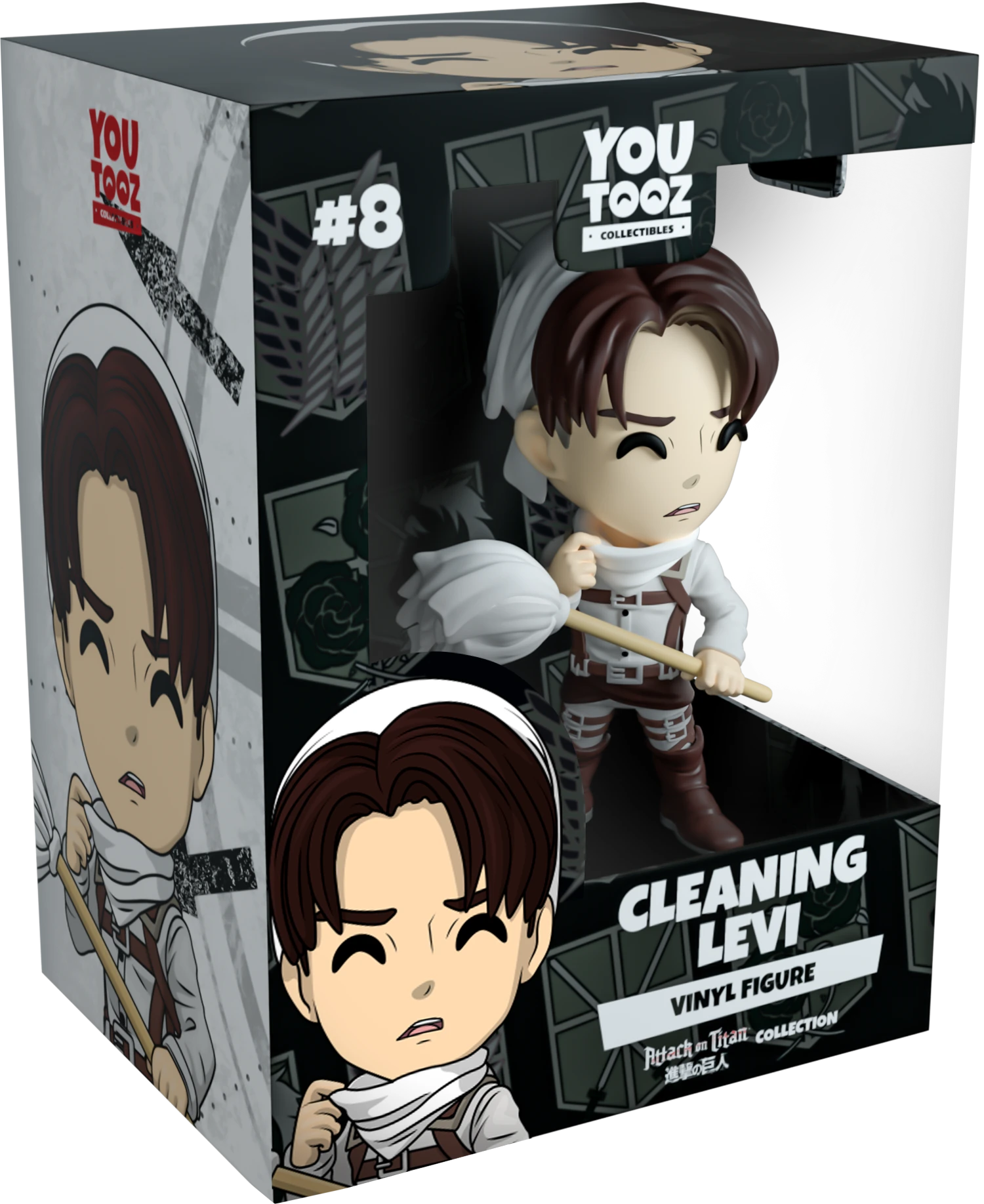 Levi’s back but this time replacing his swords and ODM gear for a white mop and cleaning gear. Standing at a tidy 4.4” he’s posed with one hand pulling his white napkin mask down to reveal a look of disapproval across his face. Another white napkin is tied around his dark brown hair to keep the dust away while he cleans. In his left hand he firmly grips a long white mop while wearing a white uniform that’s crossed with brown harnesses. The exterior of his packaging resembles the map of the walls used in the manga. While the interior pattern shows the three military regiment insignias in a grey repeating across a black background. The protective sleeve displays a closer view map encompassing the packaging. This collectible ships in a matte, embossed, protective outer sleeve and a custom sized plastic protector for maximum protection during shipping.