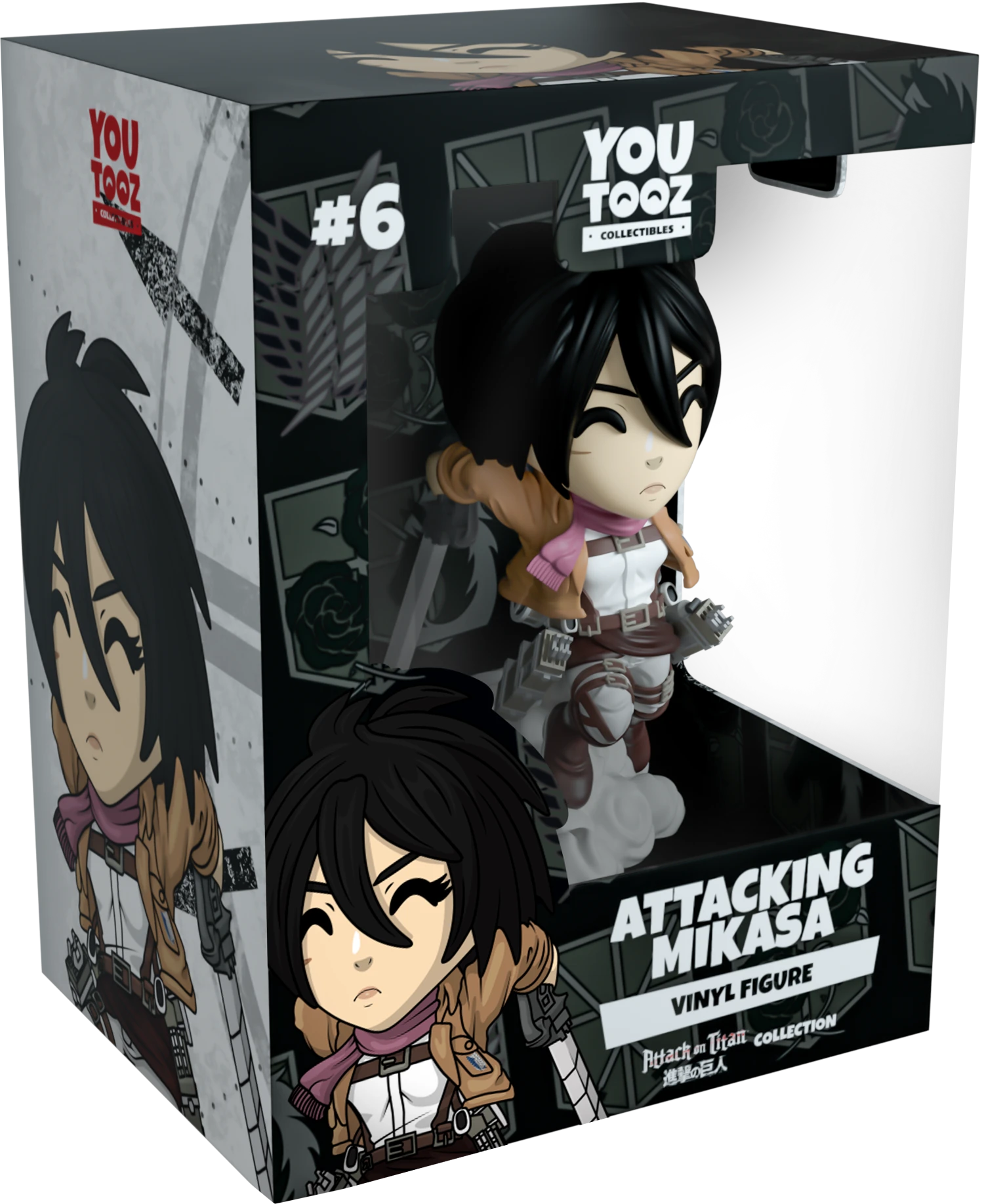 Mikasa goes in for the kill! Wielding a sword in each hand and being propelled through a burst of white smoke at 5.1” tall. Her arms are extended behind her back readying herself for a fearsome overhead cleave. With a determined look on her face peering through her black hair, you know she’s about to finish the job! She wears her treasured maroon scarf wrapped tightly around her neck and flowing to the side, along with her brown and white Survey Corps uniform and grey ODM gear. The exterior of his packaging resembles the map of the walls used in the manga. While the interior pattern shows the three military regiment insignias in a grey repeating across a black background. The protective sleeve displays a closer view map encompassing the packaging. This collectible ships in a matte, embossed, protective outer sleeve and a custom sized plastic protector for maximum protection during shipping.
