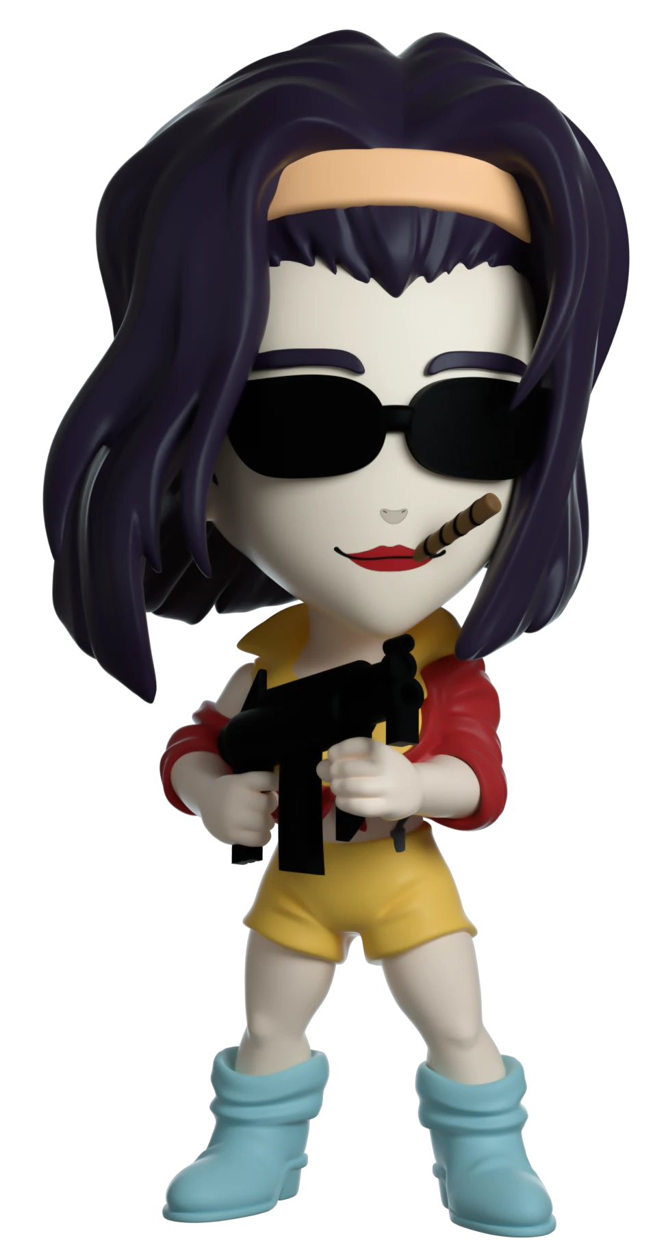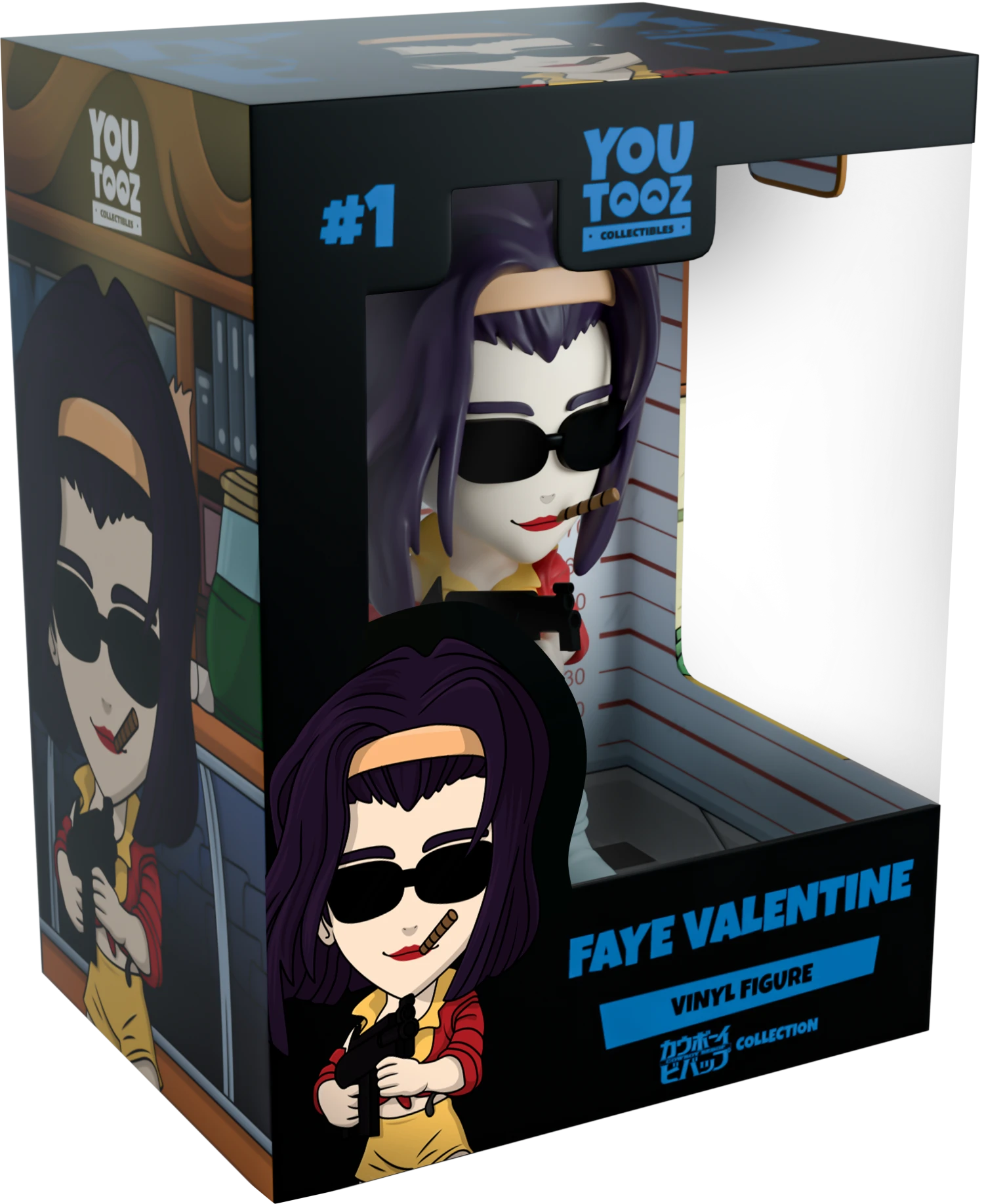 After being cryogenically frozen for 77 years, Faye Valentine crosses paths with the Bebop crew and makes some unexpected friends! Capturing holding a submachine gun in two hands, Faye means business. This go-getter is wearing yellow short-shorts, a yellow crop top and red jacket. Adding to her cool demeanor are dark tinted sunglasses. Her double-walled window box is illustrated to show the scene outside of a shop where a shootout has taken place. This collectible ships in a matte, embossed, protective outer sleeve inspired by the Cowboy Bebop opening sequence.