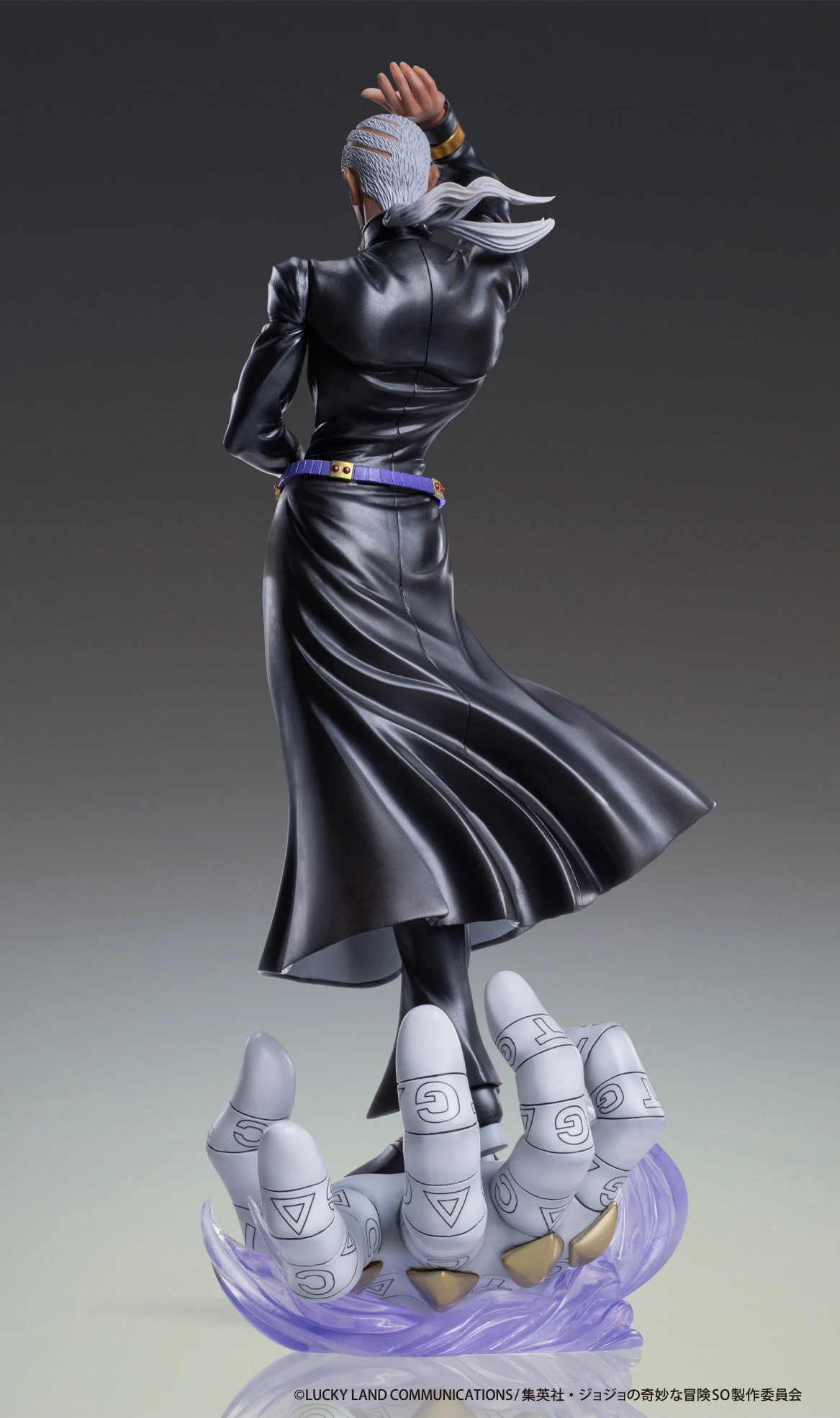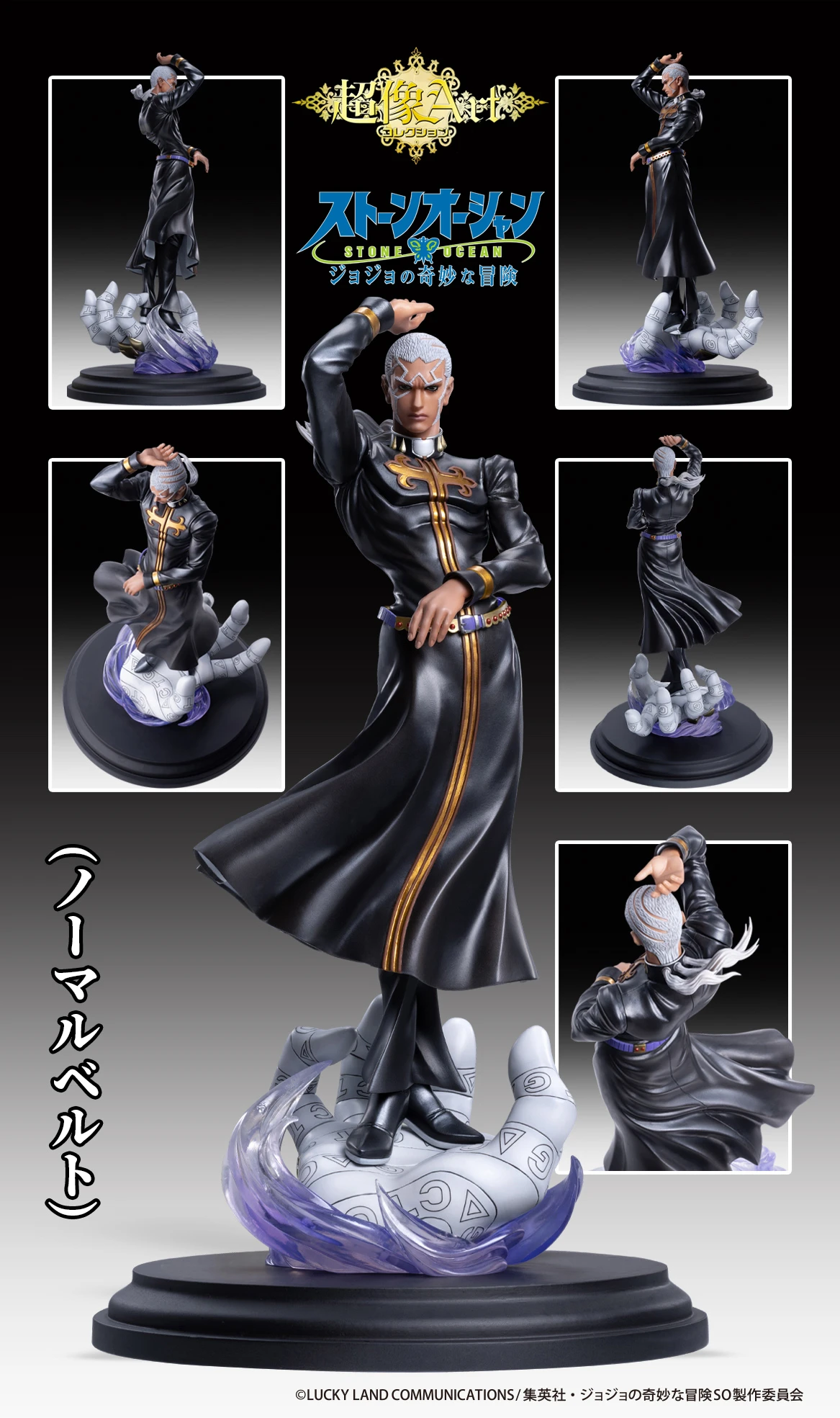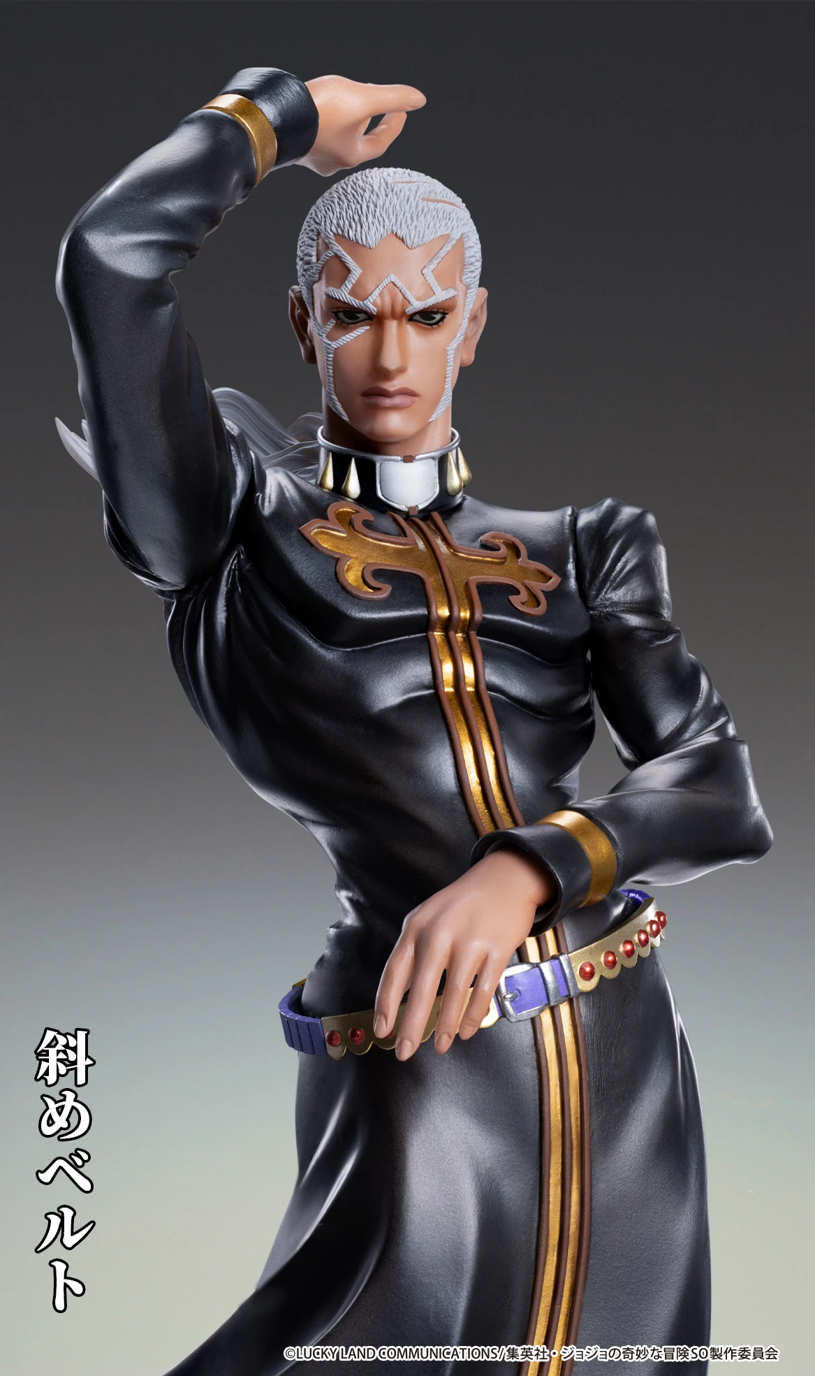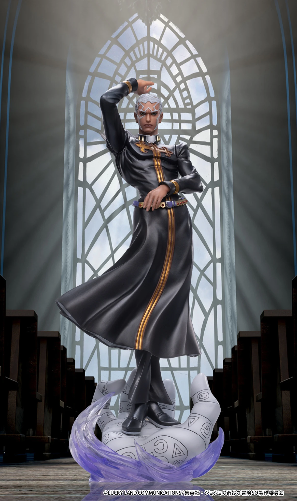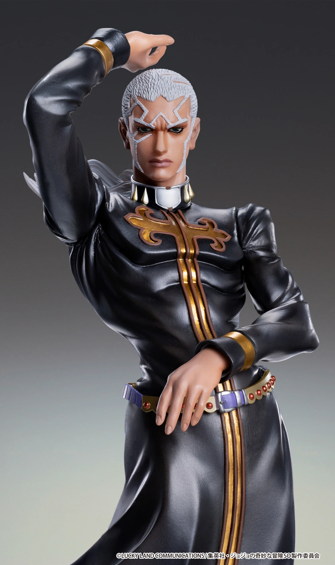 Enrico Pucci, the iconic antagonist of the sixth part of JoJo’s Bizarre Adventure, Stone Ocean, is a mysterious and manipulative priest. Possessing the Stand Weather Report, he is obsessed with creating an ideal new world using the powers of the Stands and the mysterious Stand “Made in Heaven”. His charisma and relentless determination make him one of the series’ most memorable villains, and his fight against Jolyne Cujoh and her allies is an epic battle that marks a turning point in the story of JoJo’s Bizarre Adventure and here he is in his figurine from the Statue Legend range.