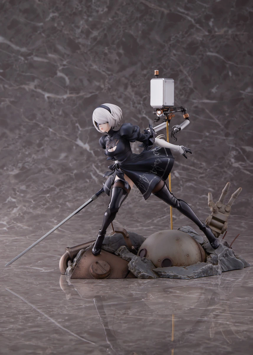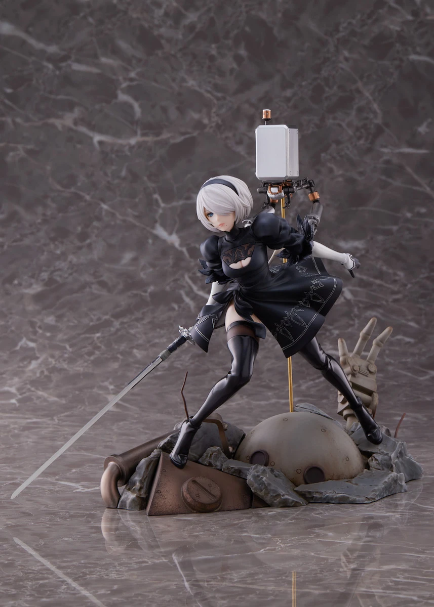 We recreated all the figure’s details in 3D, from her impressive boots to her flowing skirt in battle. The colors used in this figure were carefully chosen to faithfully reproduce the metallic nature of Virtuous Contract, 2B’s iconic sword.