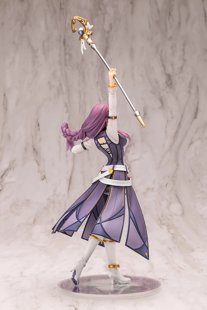 Standing with her orbal staff raised high into the sky to cast orbal arts, her posing captures a moment in the throes of battle as she supports her allies with her powerful magic.