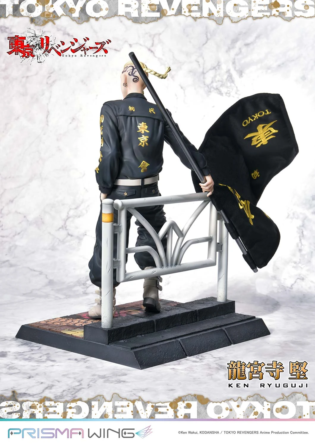 Leaning up against a guardrail in the bustling streets of Shibuya, the Vice Captain of the First Generation Tokyo Manji Gang holds a flag firmly in hand. Just like the previously released “Invincible Mikey” Manjiro Sano, his design is based on original artwork illustrated just for PRISMA WING.